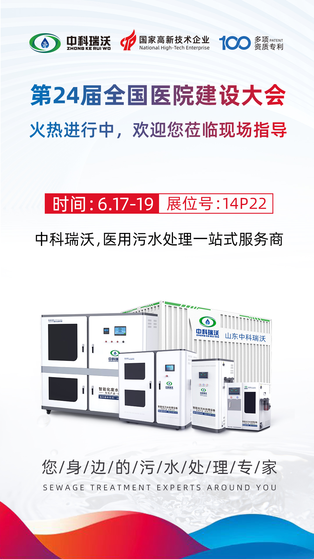 此次展會為期三天,6月17-6月19號您都可以蒞臨全國醫院建設大會中科瑞沃展位,我們將為您提供專業系統化的醫用污水解決方案!