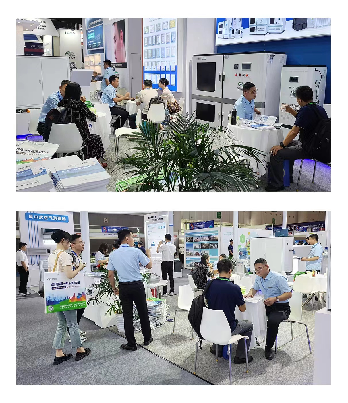 展會現場,中科瑞沃精英團隊為客戶提供1V1專屬講解服務,針對客戶想深入了解的系統化污水處理方案,設備使用,設備運維知識,售后保障等相關疑問提供熱情詳盡的解答。